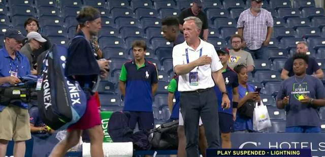 纽约市突然遭遇雷电袭击,闪电连连地划过夜空,照亮整个城市。比赛场地伴随着闪电的出现,雨水也开始倾泻而下。美国网球公开赛赛会面临突如其来的恶劣天气,紧急决定暂停了这场男单比赛,并在大屏幕上发布紧急公告:由于该地区出现闪电,室外球场比赛暂停,球迷们可以搭乘接驳车,前往阿姆斯特朗体育场寻求庇护。”