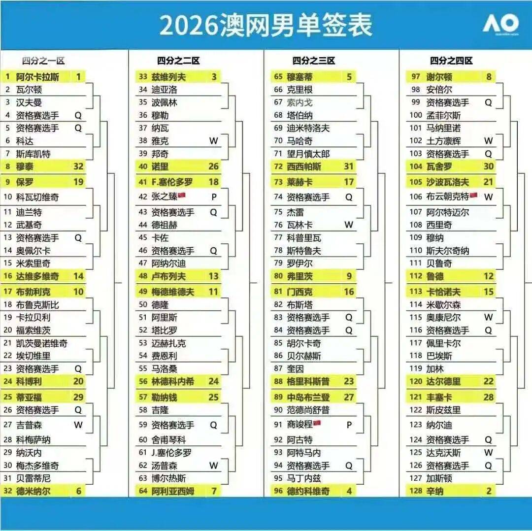 男单赛场的签表排布堪称“神仙分组”,世界第一阿尔卡拉斯与两连冠得主辛纳这两位“00后巨头”分守不同半区,若想重演巅峰对决,唯有一路过关斩将直至决赛碰面 。作为赛会头号种子,阿尔卡拉斯携2025年法网、美网双冠之势而来,此番冲击澳网桂冠以完成生涯全满贯,他与辛纳10-6的交锋战绩占优,却需在上半区直面3号种子兹维列夫的挑战,后者兼具大赛经验与战术智慧,有望成为新王登顶路上的拦路虎 。