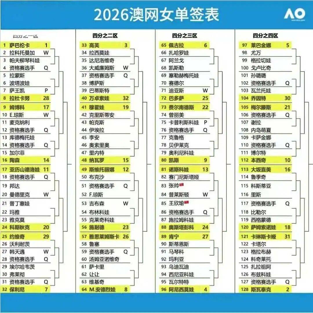 女单签表呈现“群雄割据”的格局,头号种子萨巴伦卡与2号种子斯瓦泰克分守上下半区,前者盼重夺澳网桂冠,后者则剑指生涯全满贯。萨巴伦卡所在的上半区虽整体竞争力稍弱,但可能在第二轮遭遇2025年 quarter-final 对手帕夫柳琴科娃,半决赛更可能迎来与高芙的强强对话——后者曾两次在大满贯决赛击败萨巴伦卡,心理层面占据优势 。