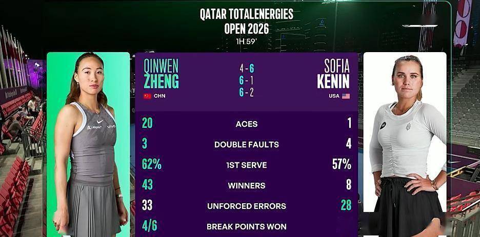 最引人注目的,是那个ACE球数据:郑钦文20记,肯宁1记。 20比1。 这不是一个等级的对决,这更像是一场发球教学赛。 郑钦文那炮弹般的发球,在多哈的夜空中划出一道道无解的轨迹,成为肯宁始终无法破解的噩梦。 在女子网坛,一场比赛能发出10个以上ACE已属出色,而20个,则是绝对的统治级表现。这20记发球直接得分,不仅仅意味着分数,更意味着对对手士气的持续重击。