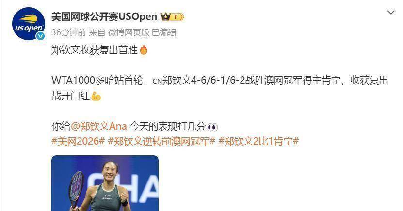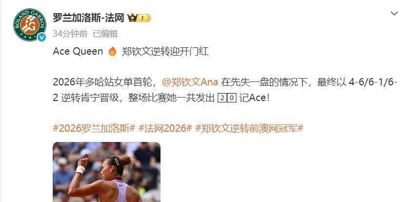 澳网官方写道:“WTA1000多哈站首轮,郑钦文在先失一盘的情况下连扳两盘,最终以4-6 6-1 6-2逆转肯宁,复出首秀迎来开门红。 ”美网官方写道:“WTA1000多哈站首轮,郑钦文4-6/6-1/6-2战胜澳网冠军得主肯宁,收获复出战开门红! ”法网官方的文案则特意点出了那个震撼的数据:“2026年多哈站女单首轮,@郑钦文Ana 在先失一盘的情况下,最终以 4-6/6-1/6-2 逆转肯宁晋级,整场比赛她一共发出20记Ace! ”